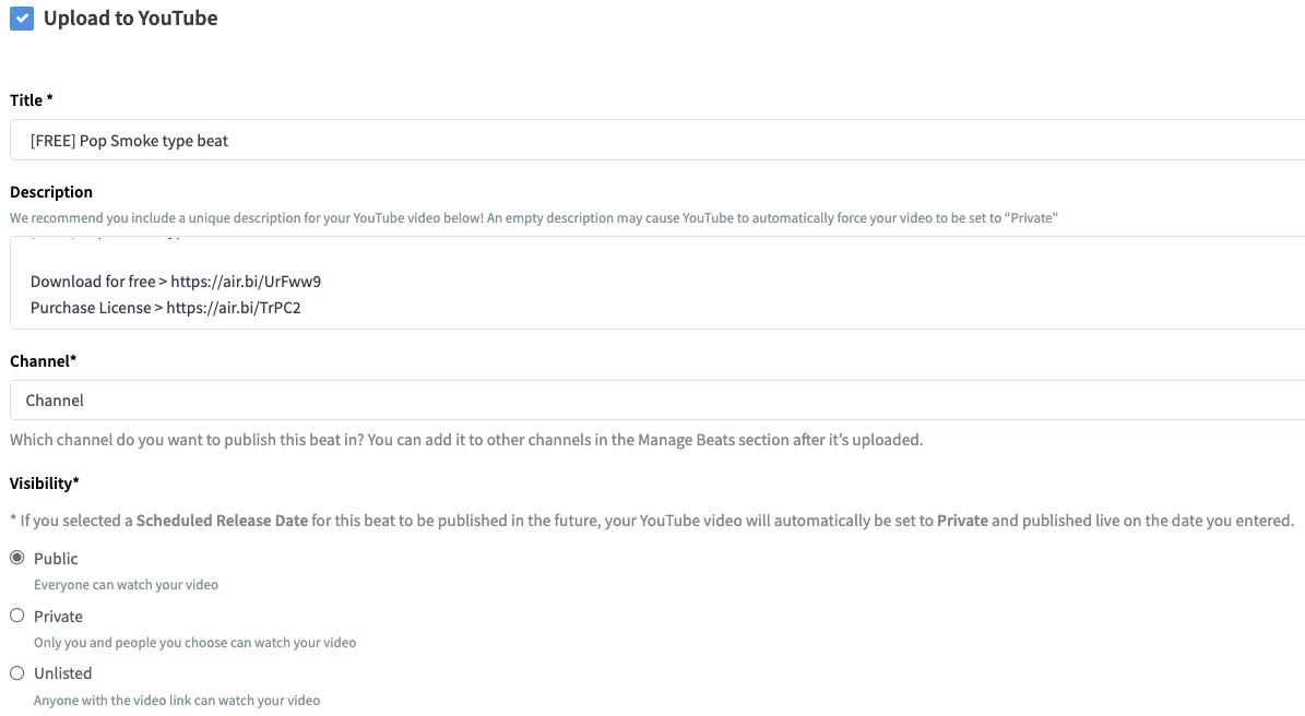 When uploading your beats to Airbit, you can automatically post these to YouTube & TikTok, with the videos created for you. Using our upload process, a video will be created containing your artwork, titles, visualizer, description, etc. and posted to each platform.