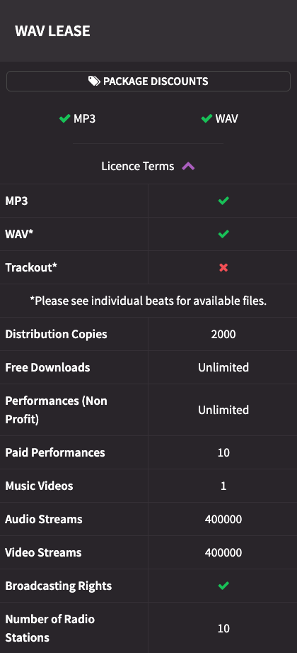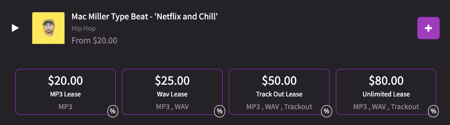 Producers have the option to provide MP3s, WAVs & Trackouts for each license. On the Marketplace we show which files are supplied with each beat in two locations: