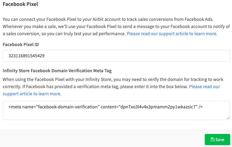 Paste the meta-tag into the Meta Tag box, in your Facebook Pixel settings section of your Airbit account shown below and click Save.