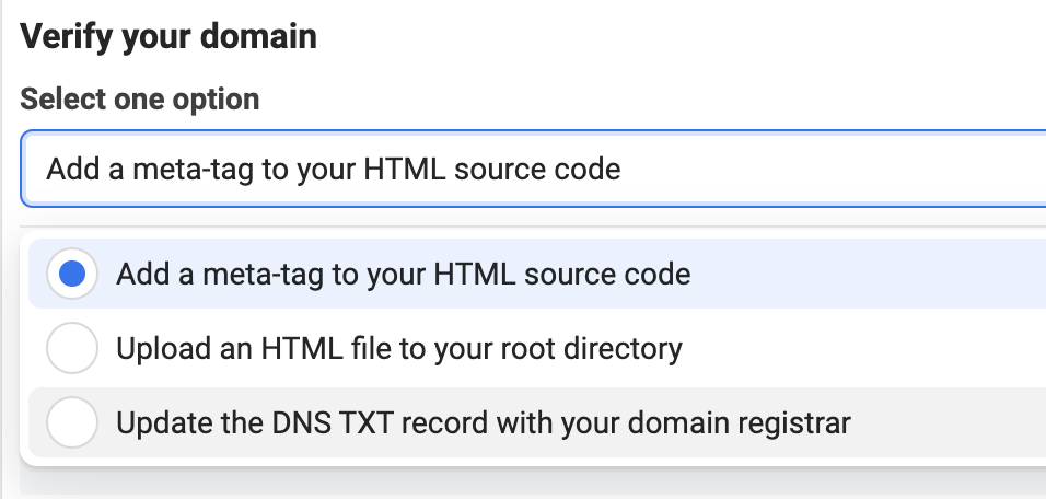 If you're using a custom domain, you can verify this through the method below, or by using the DNS TXT record option and following the steps Facebook provides. (This can be seen by following steps 1 - 5 below, then select the Update the DNS TXT record with your domain registrar option from the drop-down menu instead of step 6).