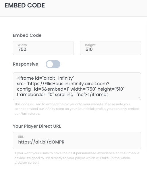 • You can find the direct URL for your HTML store for the store by clicking the Embed Code tab in Dashboard > Music Stores > HTML5 Stores